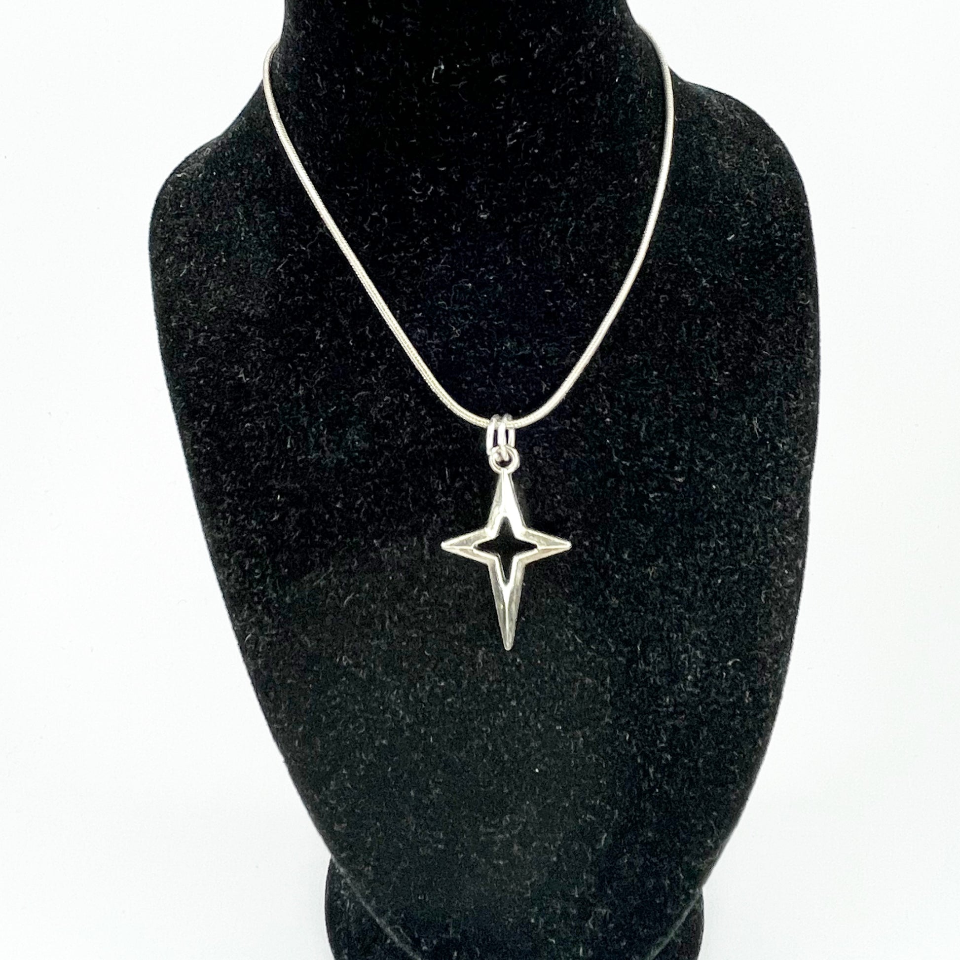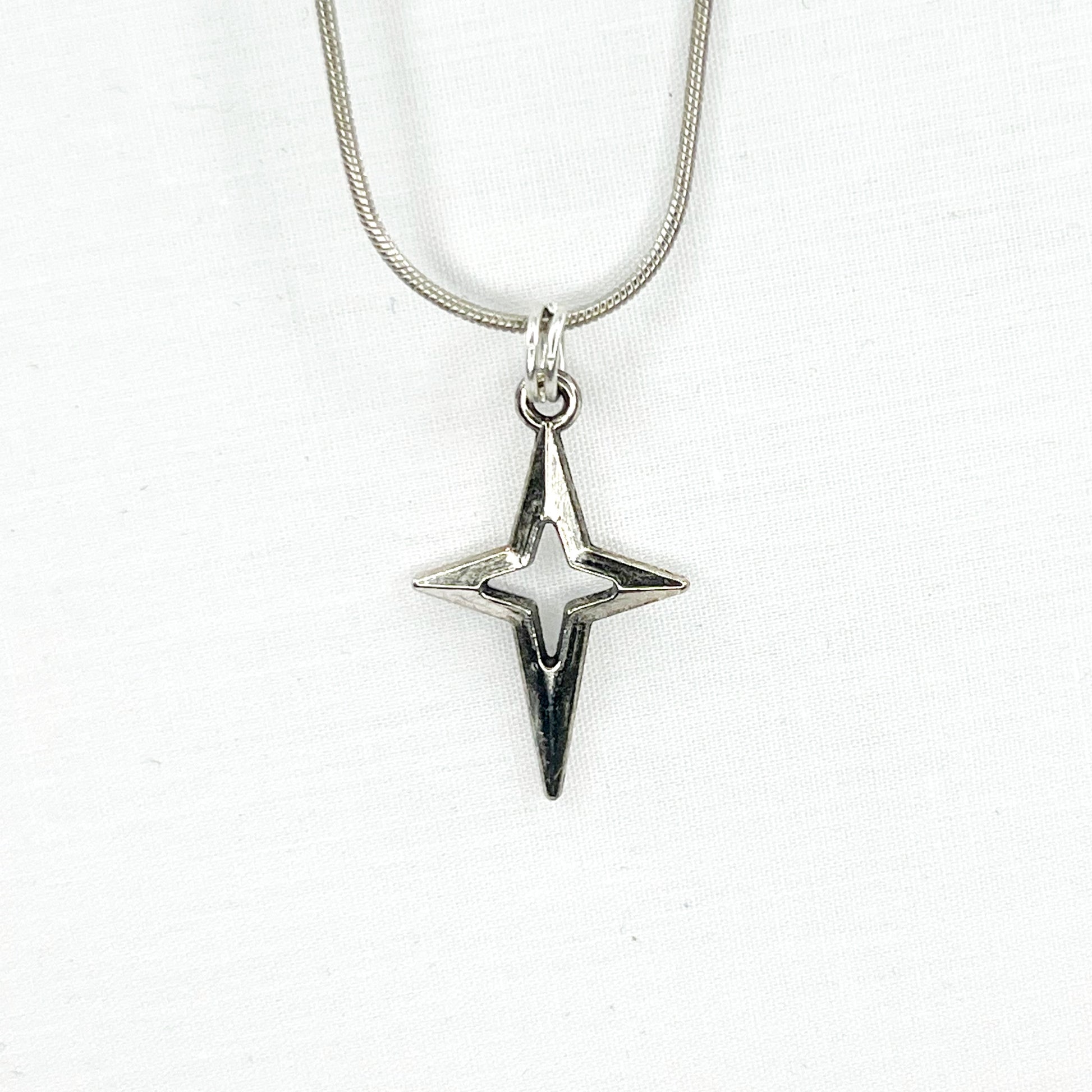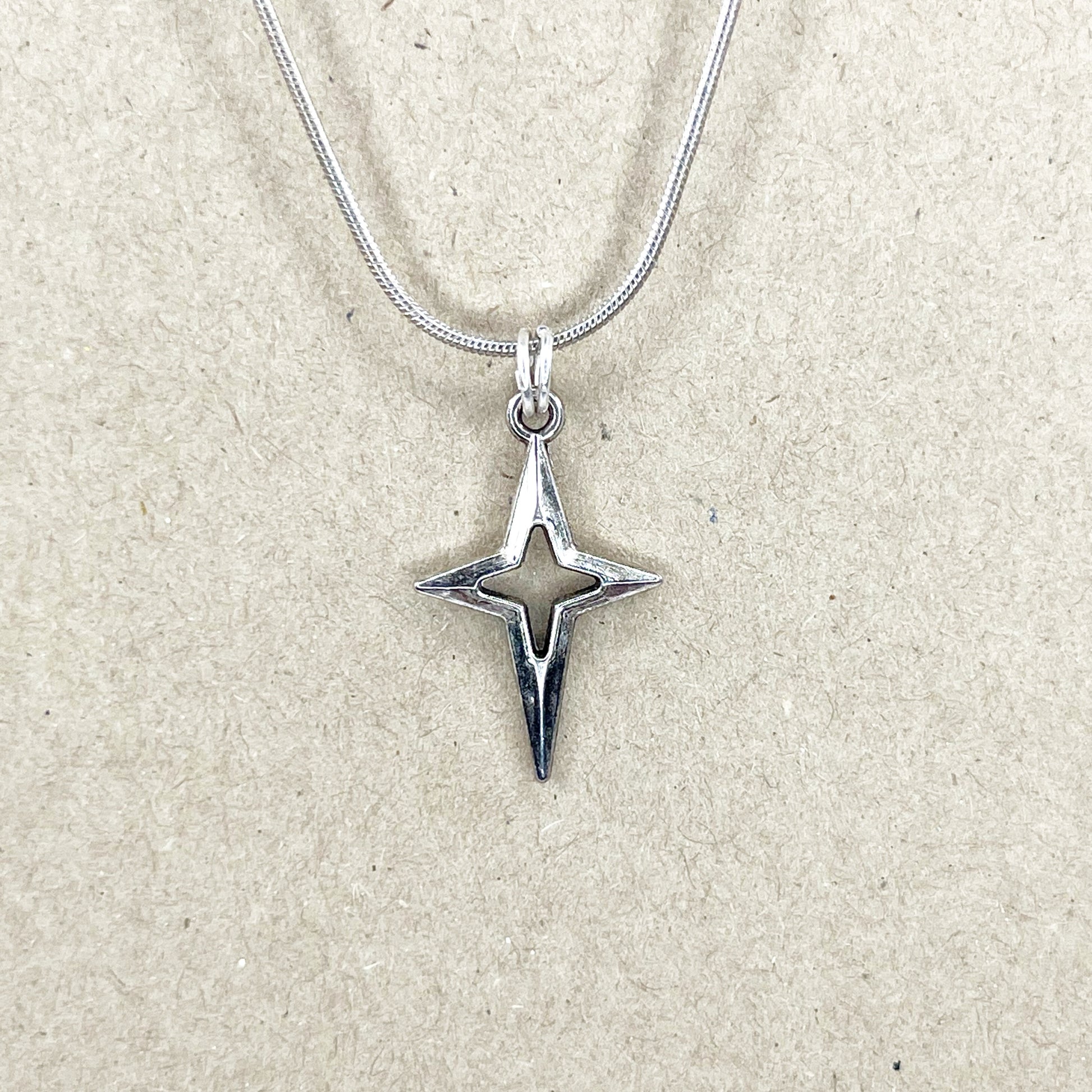 Silver plated four-pointed star pendant on 18in silver-plated snake chain. Fastens with lobster claw clasp and 2in/5cm extension chain.
