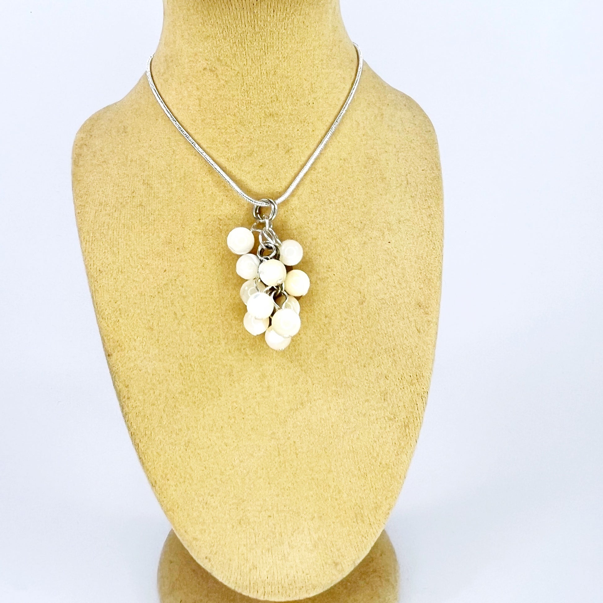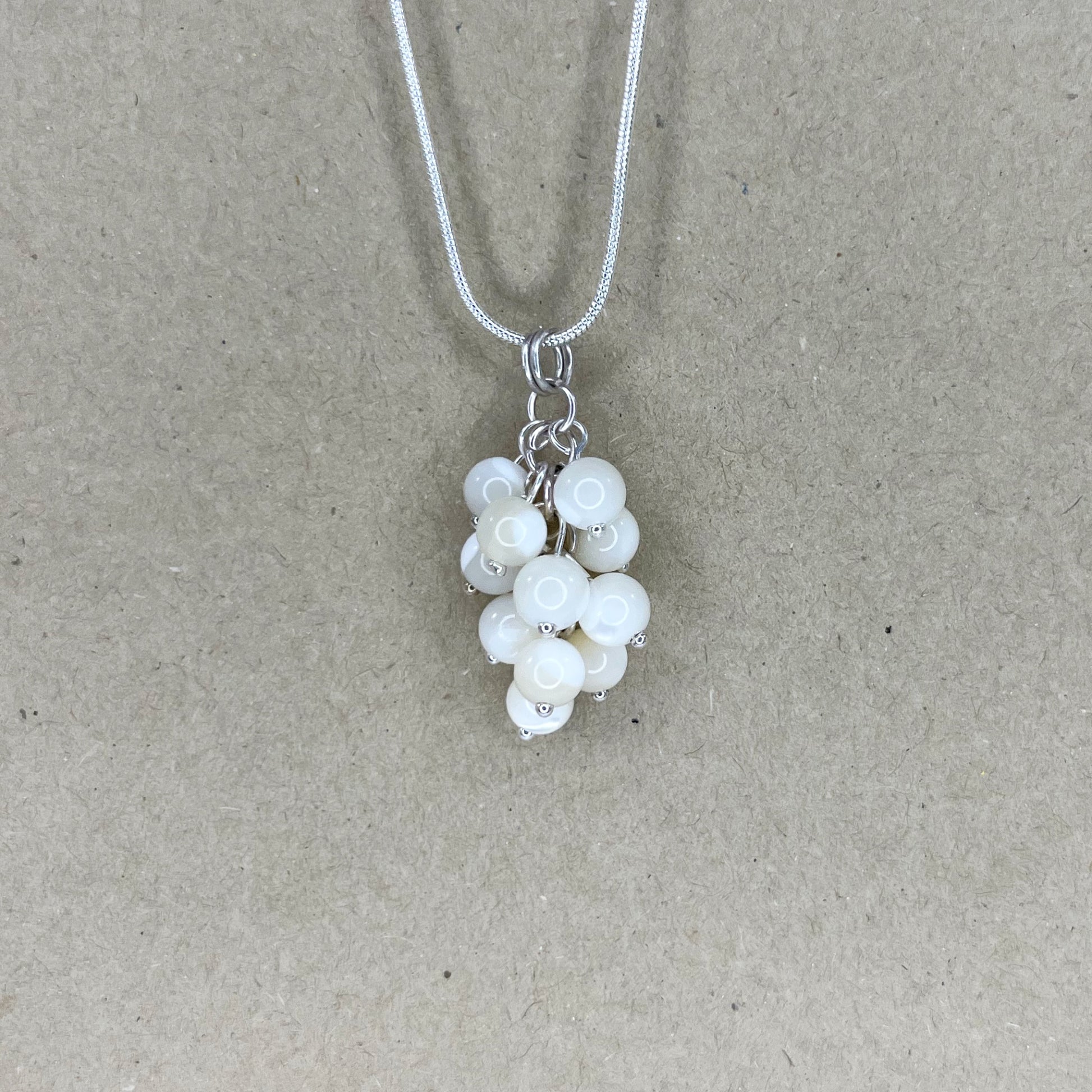 Mother of pearl cluster pendant on 17in silver plated snake chain. Fastens with lobster claw clasp